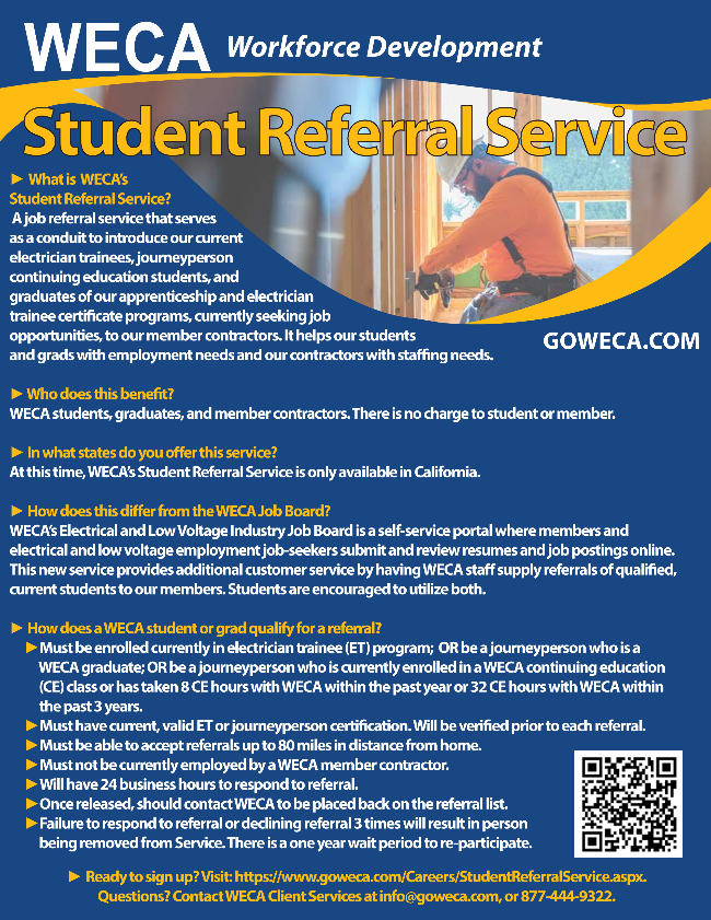 “WECA gave me not only the code knowledge, but also the practical knowledge to be successful in the electrical trade. And my on-the-job training helped me apply the things that I learned at WECA to actual installations that we do in the field,” said Jackson.