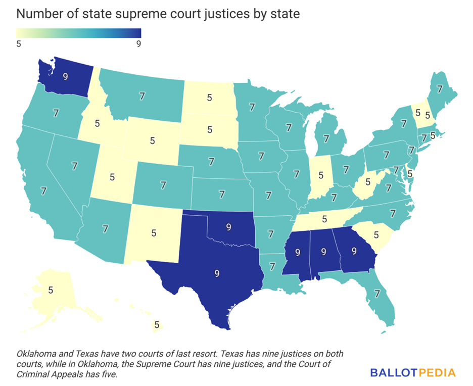 Twenty-eight state supreme courts have seven justices, the most common number. Seven state supreme courts have nine justices. Additionally, the Texas Court of Criminal Appeals — one of the state’s two courts of last resort — also has nine justices.